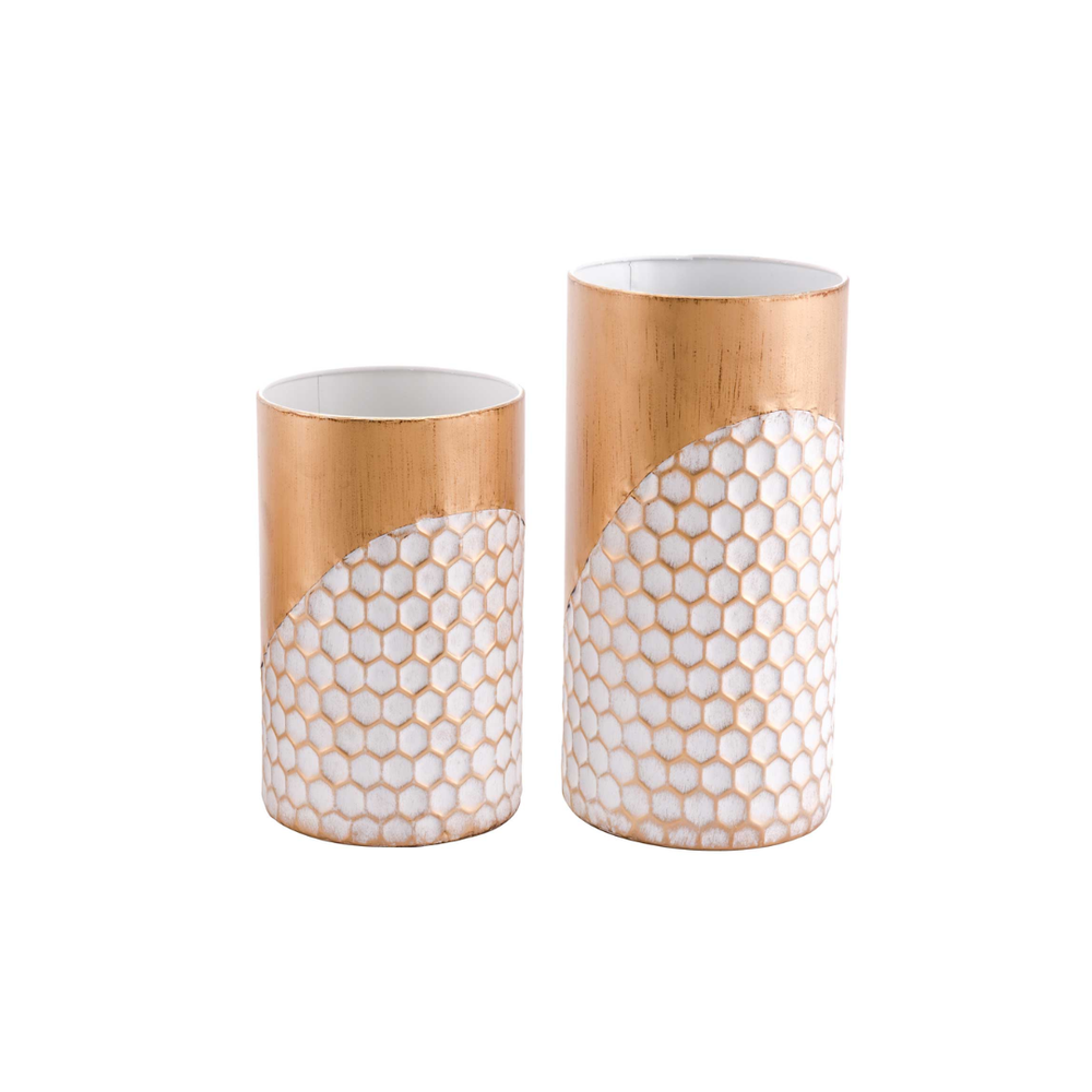 A modern gold cylinder gives way to a series of small hexagons modeled after a honeycomb pattern. Candlelight filters through the white layer to cast a soft decorative glow. This gorgeous and intriguing set of candle holders will sit perfectly on an accent table or mantle.